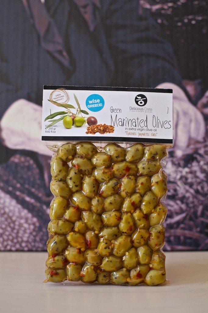 Vacuum packed large green olives marinated in Cretan herbs. Great as an appetizer with cocktails and assorted cheeses.